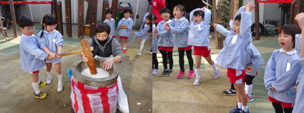 おもちをぺったんぺったんとつく迫力に驚きながらも「よいしょ!よいしょ!」と掛け声をしてくれました🚩年長組はおもちをつく体験もさせてもらいましたよ🤭