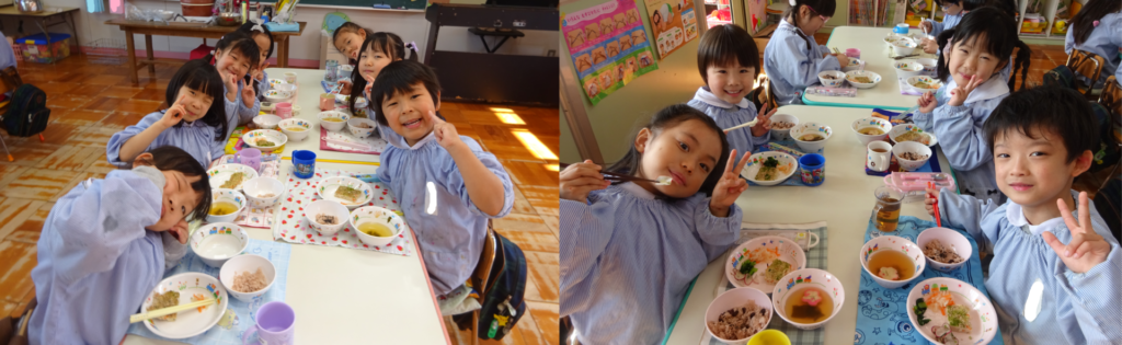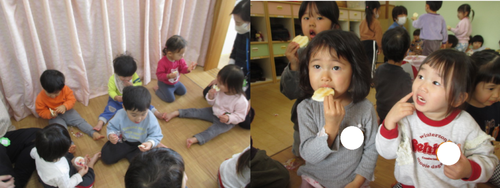 年中・年長組はできたてのおもち、年少・たんぽぽ・めばえ組はおせんべいを食べましたよ‼️
