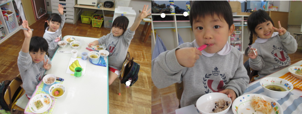 お誕生会メニューは赤飯・松風焼き・紅白なます・お吸い物のお正月メニューでした🍽️