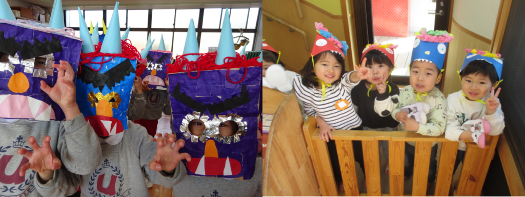 みんなが作ったお面をつけて鬼👹に変身したり、