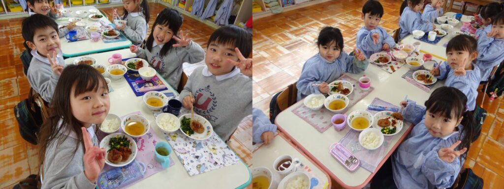 みんな大好きなハンバーグを食べて「おいしい!」とニコニコ笑顔で食べていましたよ!