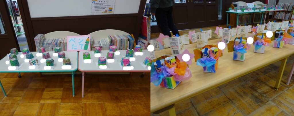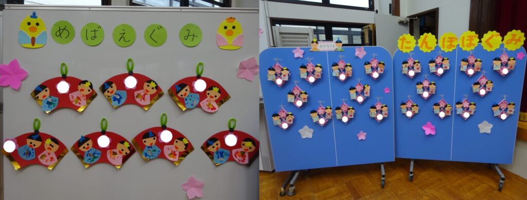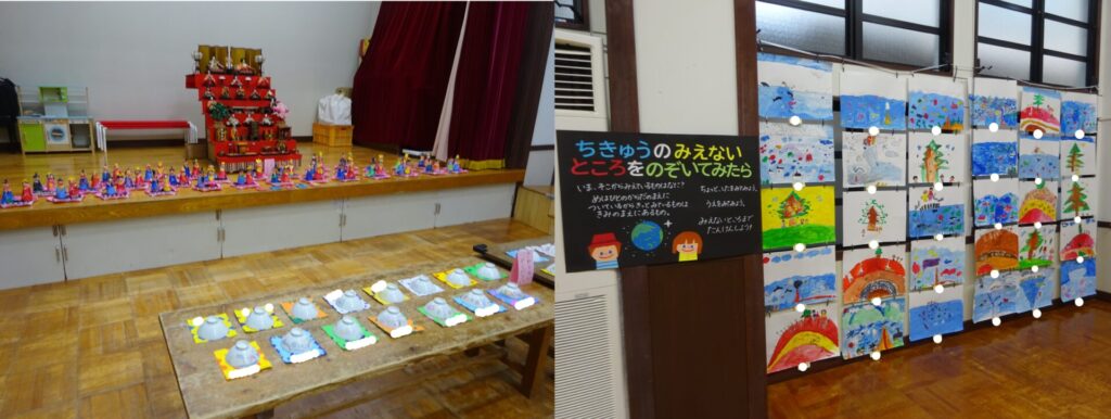 ホールに全学年のおひなさま製作や各学年の紙粘土製作を飾りました✨