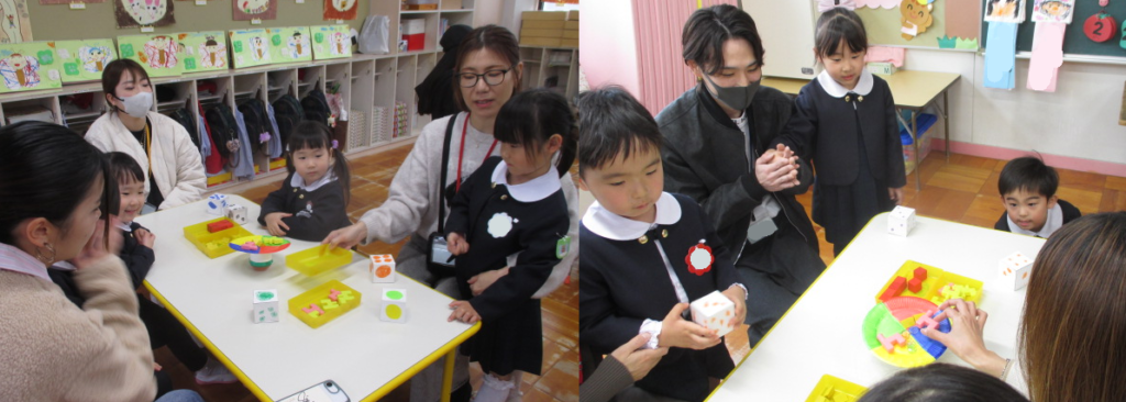 いよいよゲーム開始!サイコロの出た目と色のところへおはじきや積み木を