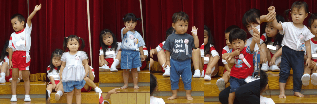 めばえ組では「手をたたきましょう」のお歌をおうちの人と一緒に少し照れながらも歌うことができました👏🎵